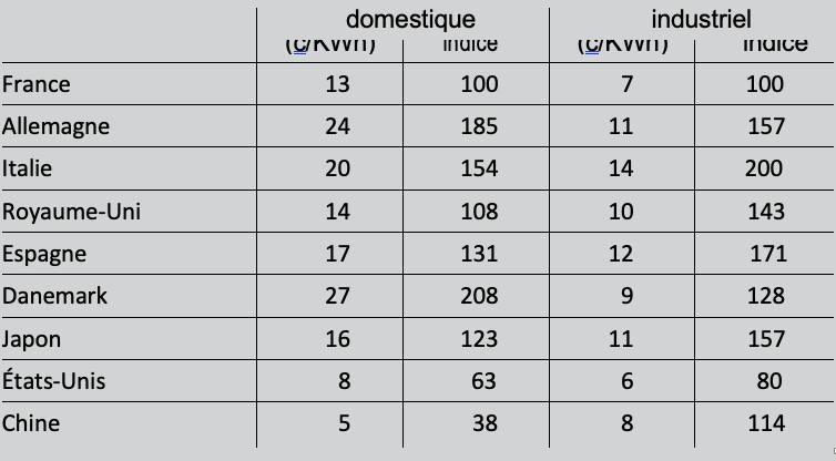 On voit que les prix de l’électricité en France sont particulièrement bas. Dans la plupart des pays d’Europe, les utilisateurs paient beaucoup plus cher qu’en France l’électricité qu’ils consomment. Les industriels italiens ou les ménages danois paient le double de ce que paient leurs collègues français. Dans des pays comme la Chine ou l’Inde, les prix sont plus bas qu’en France, mais c’est parce que la production d’électricité est assurée par du charbon bon marché ou/et y est subventionnée. Ces bas prix français reflètent des coûts faibles, qui résultent eux-mêmes de la part importante du nucléaire dans le mélange électrique français. Les prix élevés danois et espagnols reflètent les coûts élevés de ces champions de l’éolien et du photovoltaïque.