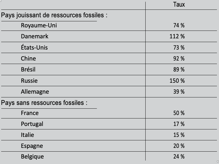 Les statistiques de l’Agence internationale de l’énergie permettent de calculer ce taux de dépendance, pour les pays de notre échantillon, d’une façon homogène. C’est ce que fait le tableau 7, en distinguant les pays qui ont la chance de bénéficier de ressources naturelles fossiles (pétrole, charbon, gaz), et ceux qui n’ont pas cette chance.