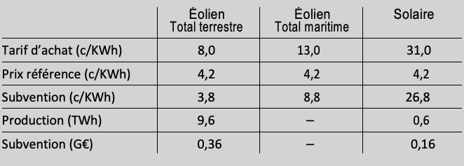 Tableau 8 : Coût des subventions à l’éolien et au solaire, France, 2010