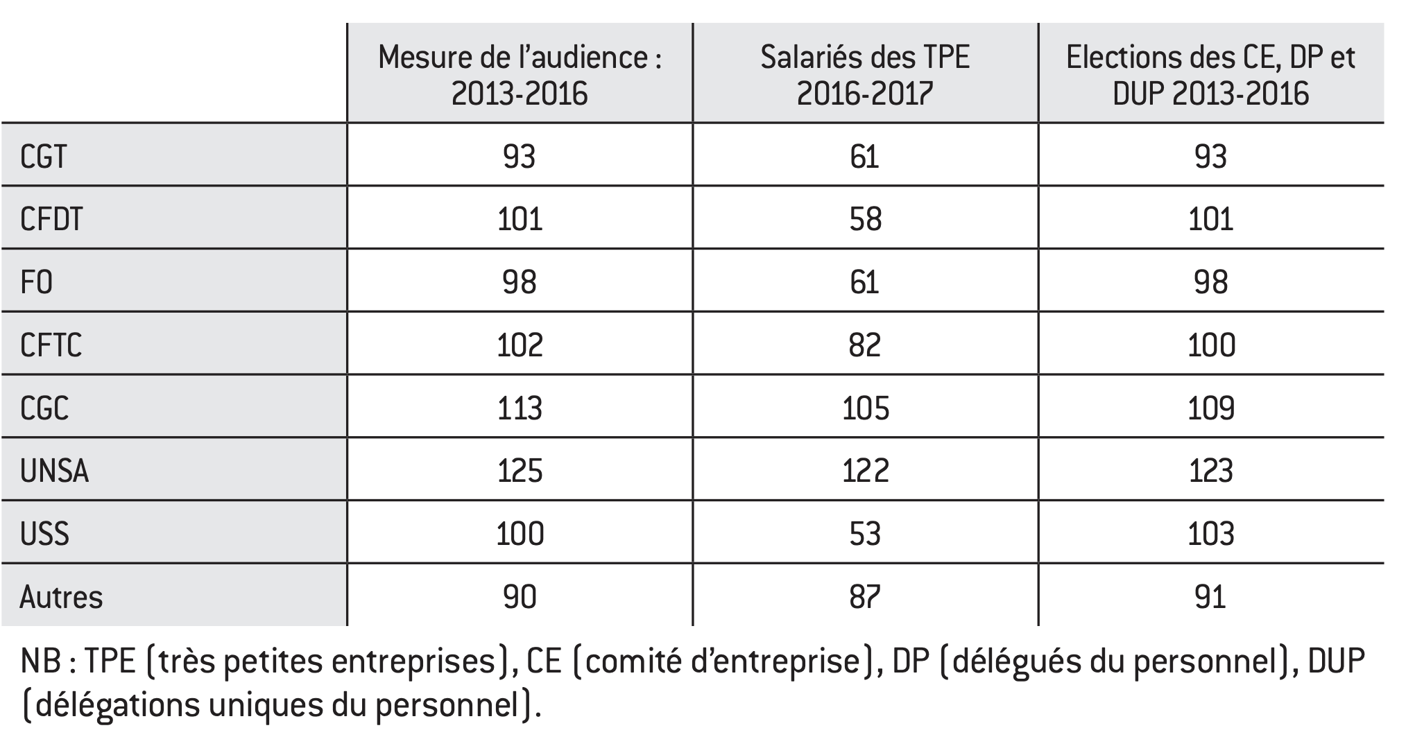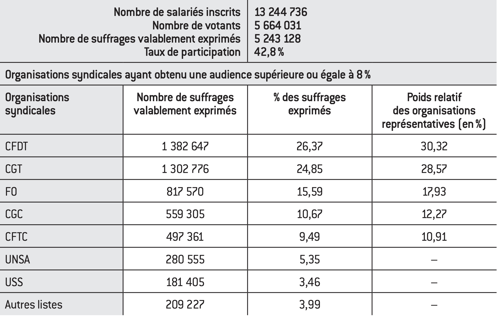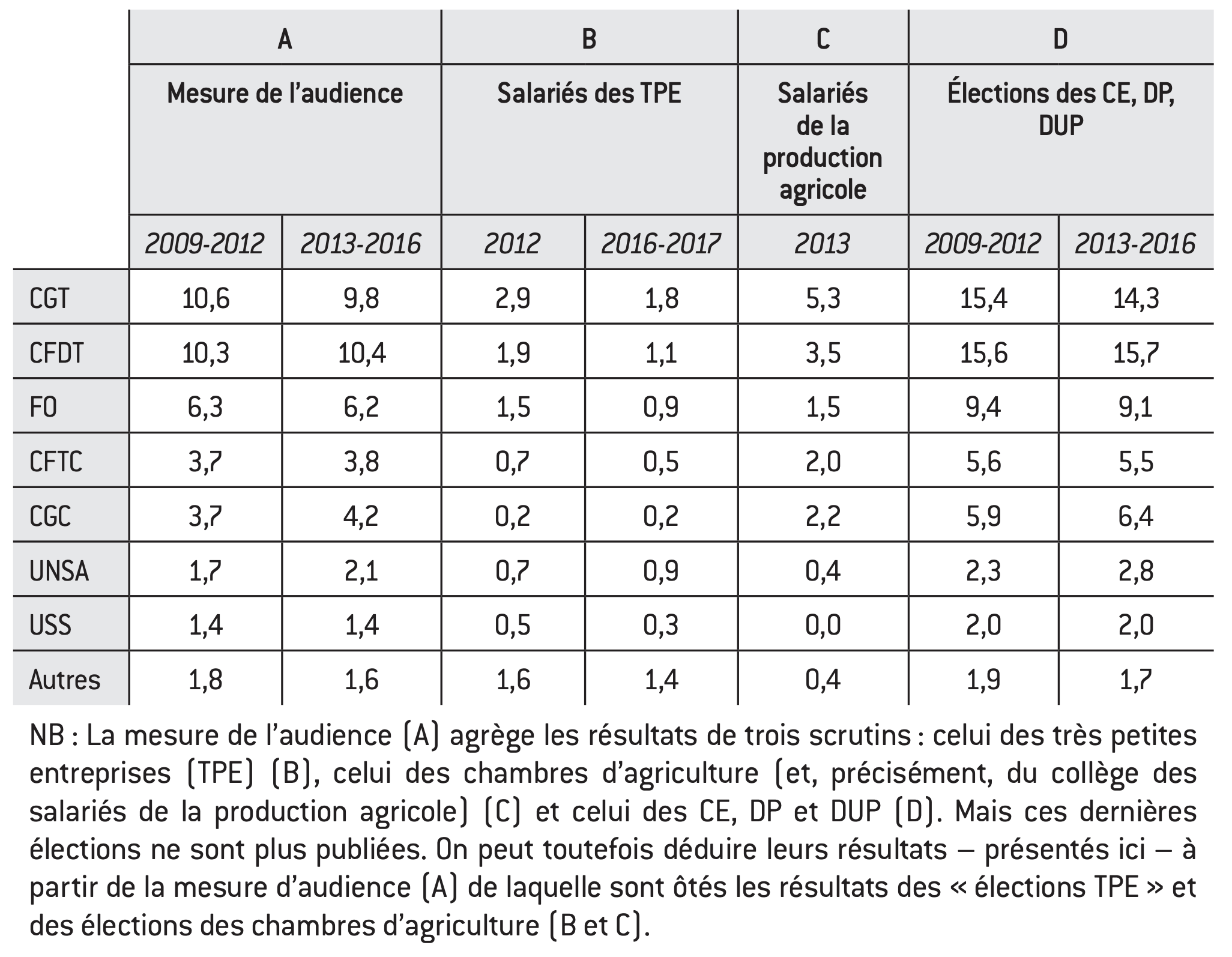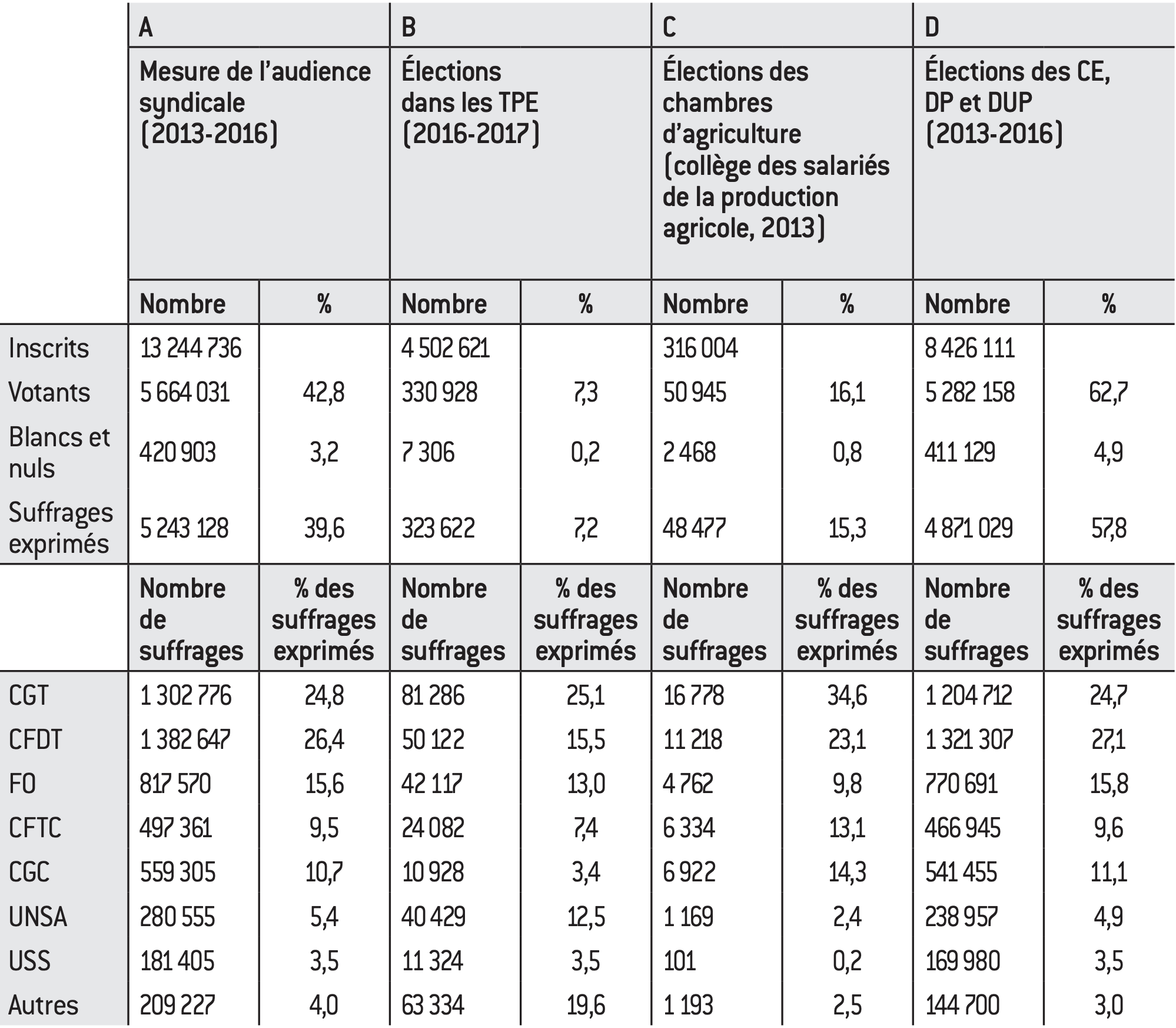 En mars 2017, le ministère du Travail a publié les résultats de la deuxième « mesure d’audience pour la représentativité syndicale », couvrant la période 2013-2016. Depuis la loi portant rénovation de la démocratie sociale et réforme du temps de travail du 20 août 2008, cette mesure détermine quels sont les syndicats représentatifs, autrement dit les interlocuteurs obligés des employeurs au niveau des entreprises, des branches d’activité et au niveau national interprofessionnel. C’est également en fonction de ces derniers résultats que les gouvernements fixent la liste des organisations invitées à participer aux concertations sur les réformes sociales inscrites à leur agenda, voire à ouvrir une négociation sur le sujet (en vertu de l’article 1 du code du travail)1.