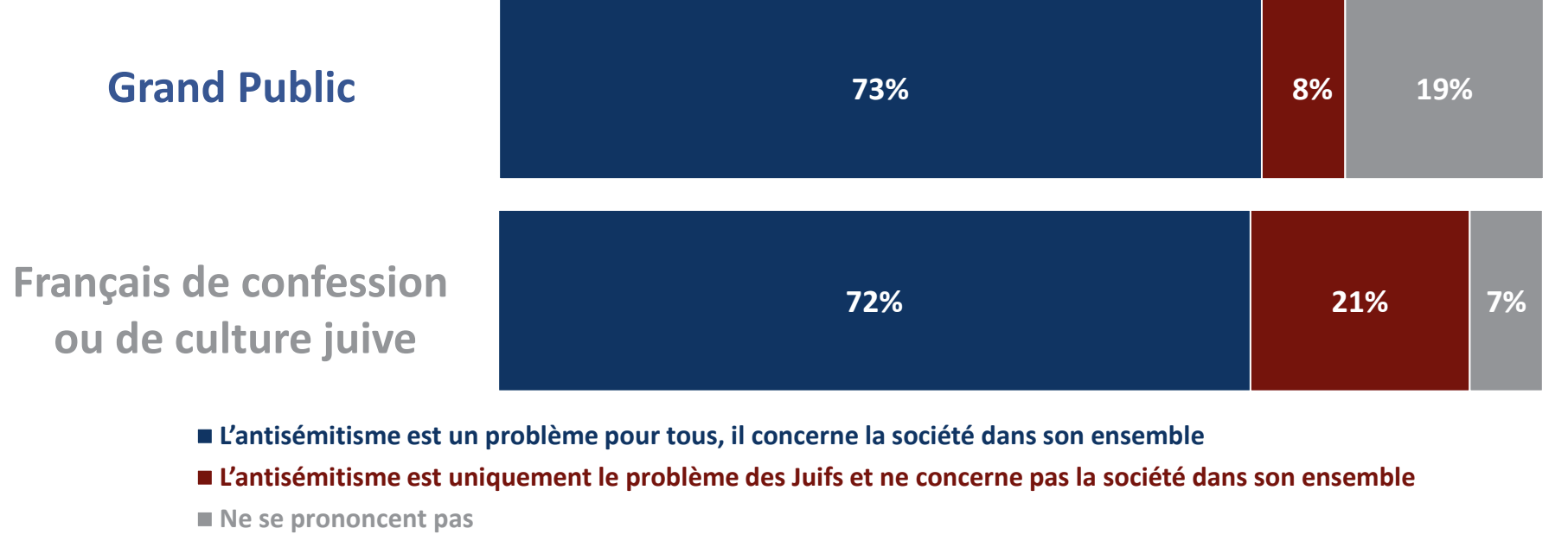 Le grand public et les Juifs de France s’accordent assez largement pour dire que l’antisémitisme est un problème pour tous et concerne la société dans son ensemble. Cette opinion est partagée à 73% par le grand public et à 72% par les Français de confession ou de culture juive. À l’inverse, ces derniers ne sont que 21% à estimer qu’il s’agit seulement du problème des Juifs. Cette opinion est encore moins marquée au sein du grand public (8%).