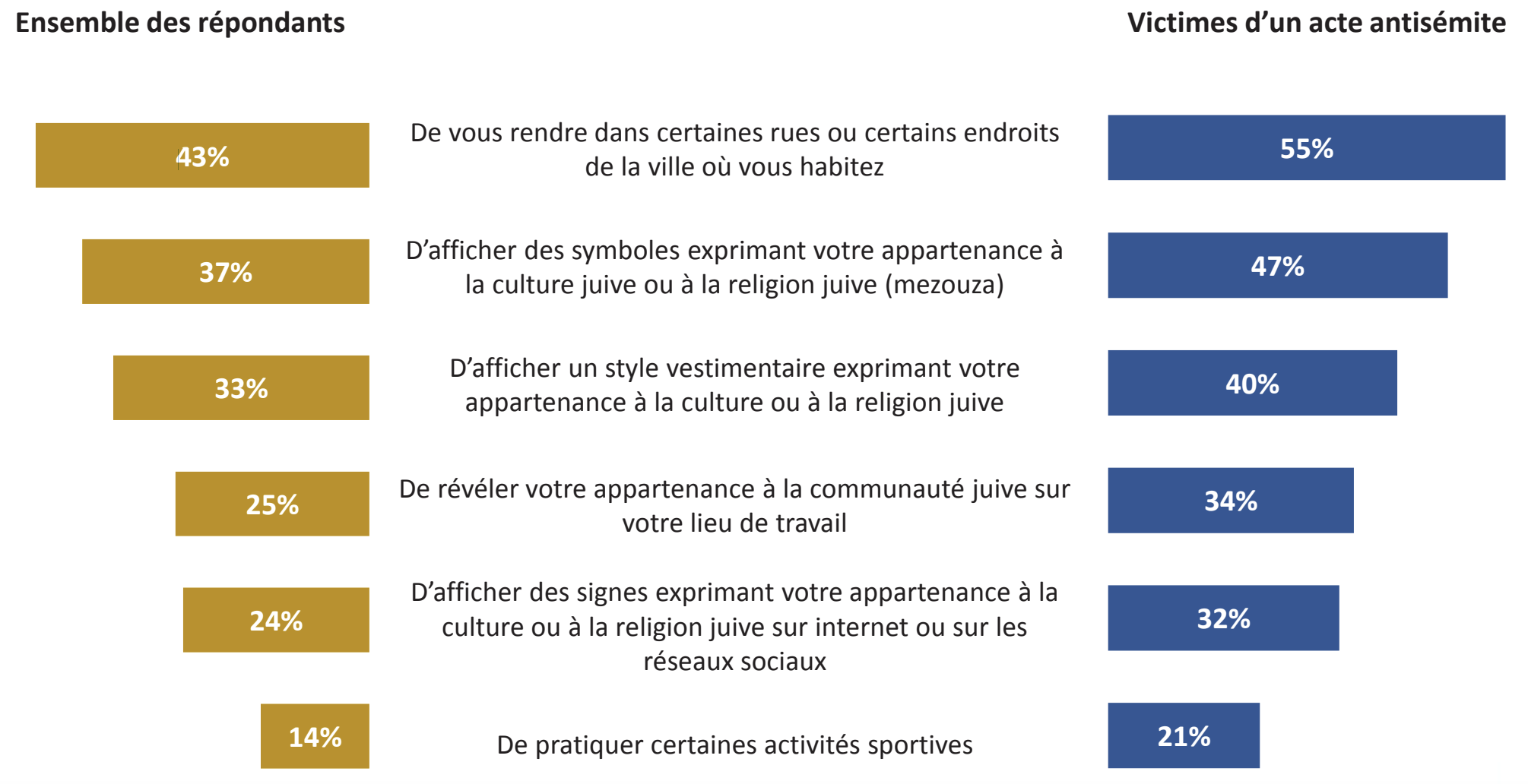 Ce climat conduit une partie des Français de confession ou de culture juive à éviter certains territoires (43% pour l’ensemble des personnes interrogées et 55% pour ceux qui ont subi une agression antisémite) mais également à adopter une stratégie d’invisibilité. Ils sont ainsi un tiers à éviter d’afficher des symboles comme la mézouza exprimant leur appartenance au judaïsme (37% et 47% pour les victimes) ou à afficher un style vestimentaire exprimant leur appartenance à la culture juive (33% et 40%). Par ailleurs, un quart des personnes interrogées (et un tiers des victimes) déclarent avoir déjà évité de révéler leur appartenance à la communauté juive sur leur lieu de travail.