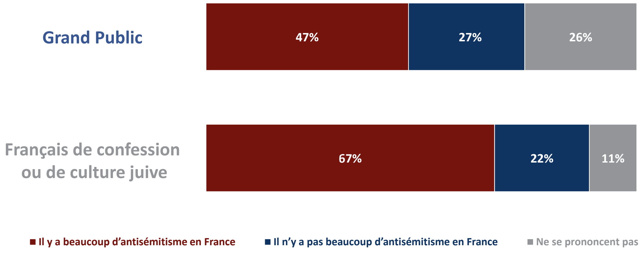 La perception des Français de confession ou de culture juive et du grand public converge concernant la prévalence et la recrudescence ressentie de l’antisémitisme. L’opinion dominante, autant chez les Juifs qu’au sein du grand public, est qu’il y a beaucoup d’antisémitisme en France : 67% des Juifs et 47% des membres du grand public estiment qu’il y en a beaucoup (contre 22% et 27% qui estiment qu’il n’y en a pas beaucoup, et 11% et 26% qui ne se prononcent pas). Le phénomène est aussi vu comme étant en recrudescence : 77% des Juifs et 53% des membres du grand public estiment qu’il est en augmentation (contre 12% et 18% en diminution et 11% et 29% qui ne se prononcent pas).