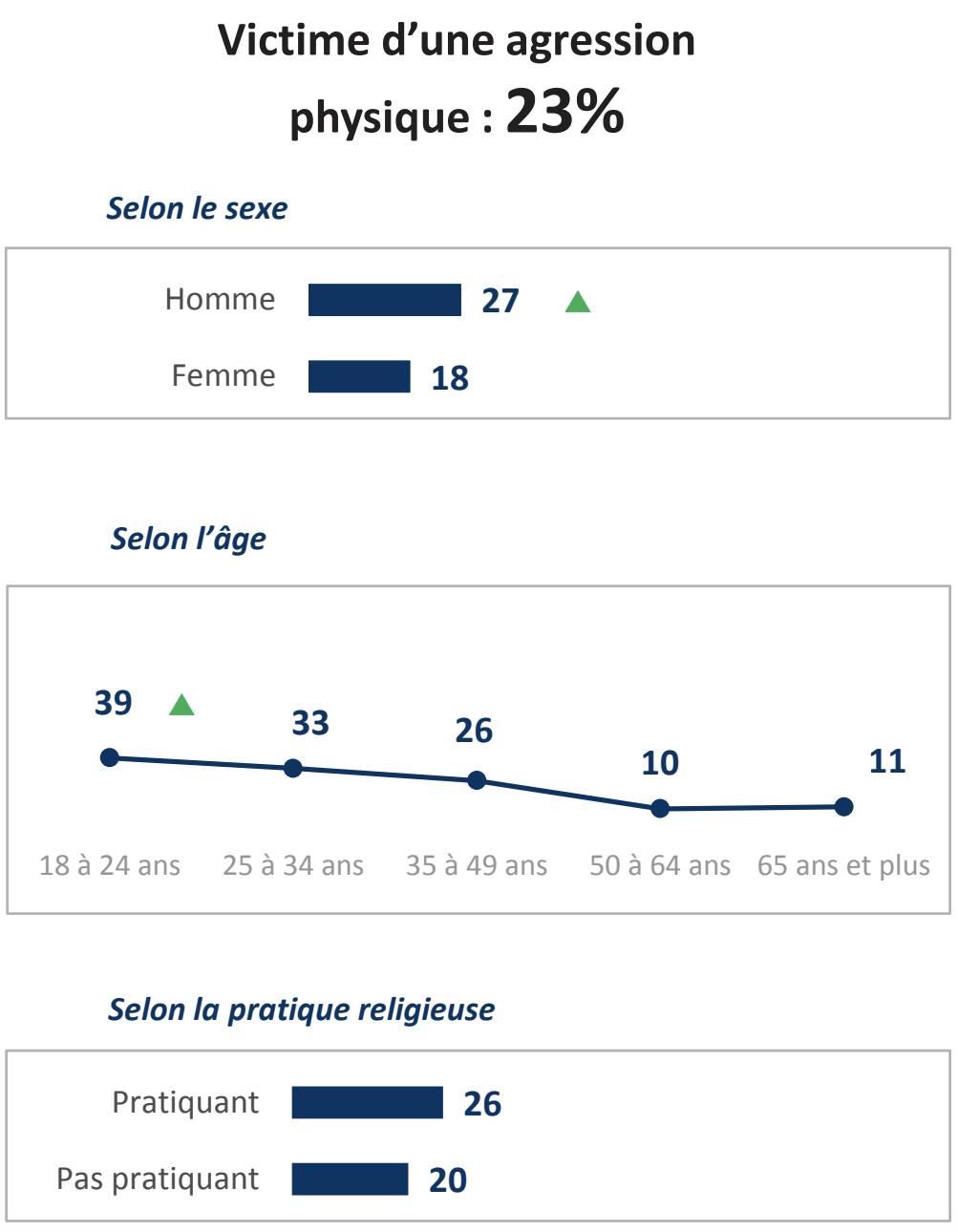 Les Français juifs ne sont pas épargnés par la violence physique : 23% d’entre eux indiquent ainsi avoir été victimes à au moins une reprise d’un acte de violence physique, dont 10% déclarent y avoir été confrontés à plusieurs reprises.