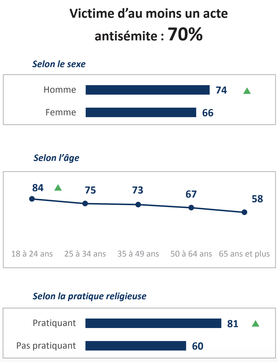 Au-delà du ressenti d’un phénomène présent et en augmentation, 70% des Français de confession ou de culture juive déclarent avoir été victimes d’au moins un acte antisémite au cours de leur vie