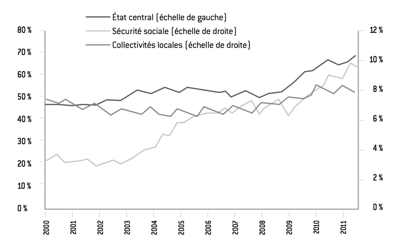 L’endettement public comporte trois composantes : l’endettement de l’État central et déconcentré, celui des collectivités locales et celui des organismes de sécurité sociale.