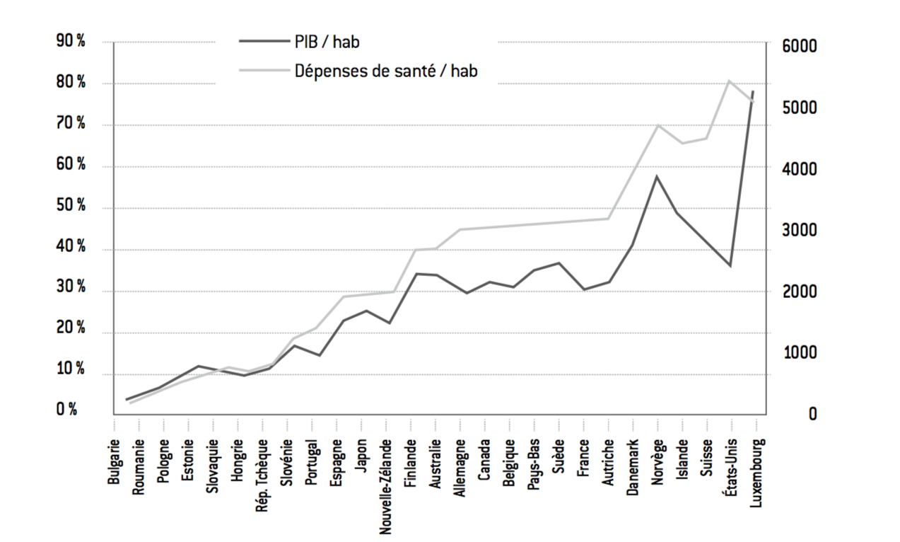 Figure 3 : PIB par habitant et dépenses de santé par habitant (en euros)