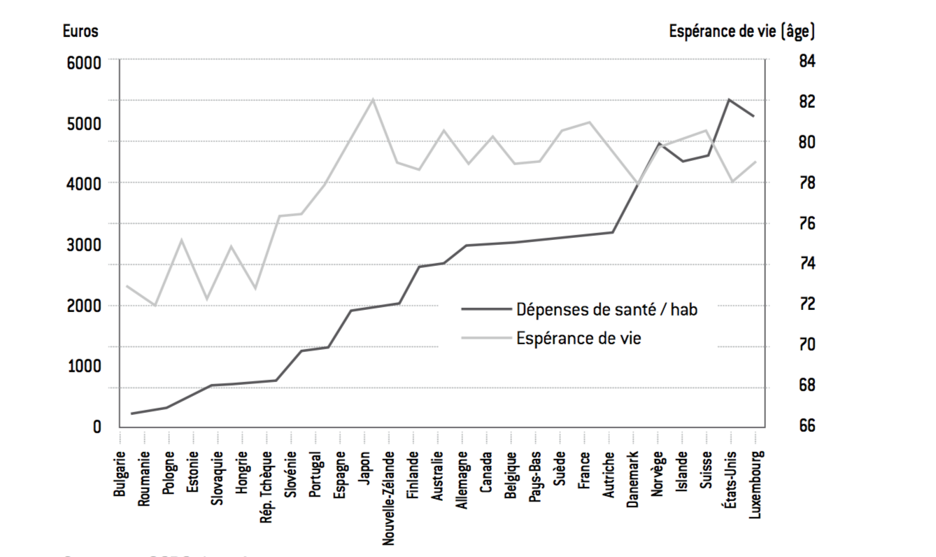 Figure 4 : Dépenses de santé par habitant (en euros) et espérance de vie à la naissance