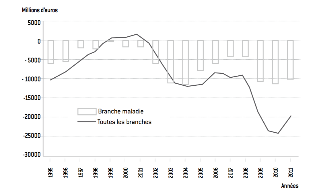 Ce déficit est très largement structurel dans la mesure où les fluctuations économiques sont incapables de le résorber, même temporairement. Même à la toute fin des années 1990 et en 2000, lorsque la croissance économique et les créations d’emplois ont été soutenues, le déficit du régime général ne s’est jamais mué en excédent ; autrement dit, l’augmentation des recettes n’a jamais été suffisante pour compenser la hausse des dépenses.