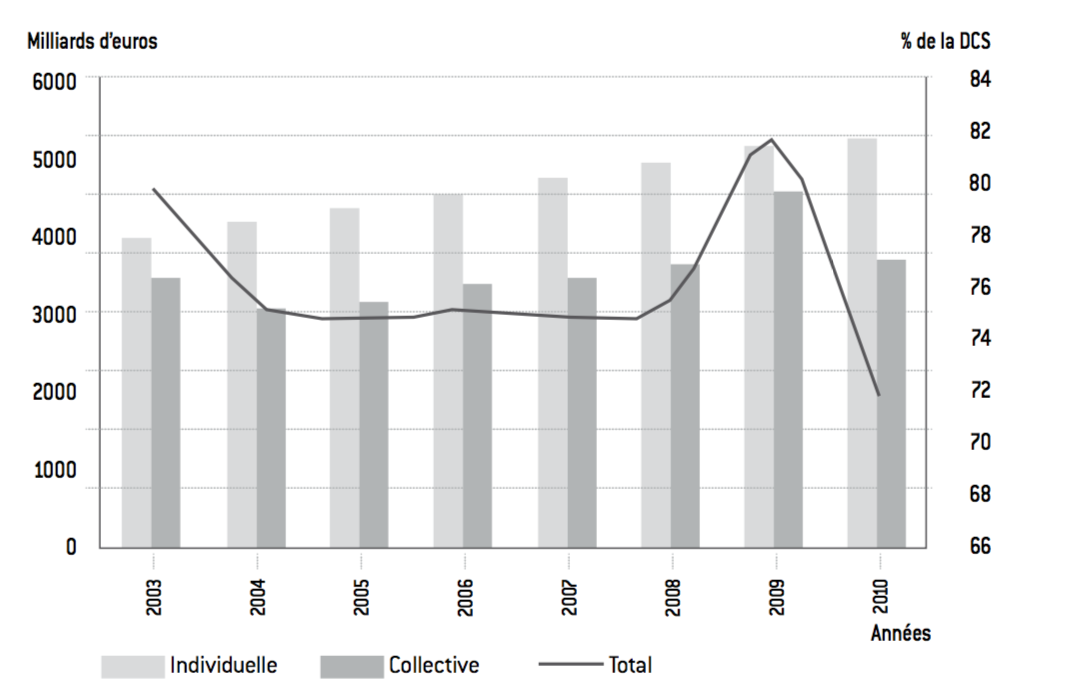 La Sécurité sociale prend en charge en France un peu plus de 75% de la consommation de soins et biens médicaux. Cette part est relativement stable dans le temps, la prise en charge publique ne reculant qu’extrêmement lentement. Le reste est essentiellement pris en charge par les organismes complémentaires et les ménages eux-mêmes. L’assurance maladie rembourse essentiellement des soins de ville (46% des financements de l’assurance maladie) et des soins d’accueil en établissements de santé (45% des financements)10. Elle est essentiellement financée par l’impôt et les cotisations sociales.