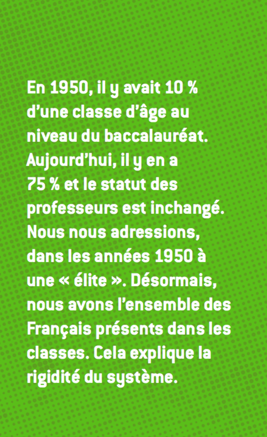 En 1950, il y avait 10% d’une classe d’âge au niveau du baccalauréat. Aujourd’hui, il y en a 75% et le statut des professeurs est inchangé. Nous nous adressions, dans les années 1950 à une « élite ». Désormais, nous avons l’ensemble des Français présents dans les classes. Cela explique la rigidité du système.