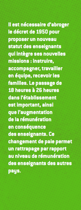 Le principe et la mise en œuvre de cette réforme sont simples. Il est nécessaire d’abroger le décret de 1950 pour proposer un nouveau statut des enseignants qui intègre ses nouvelles missions : instruire, accompagner, travaille en équipe, recevoir les familles. Le passage de 18 heures à 26 heures dans l’établissement est important, ainsi que l’augmentation de la rémunération en conséquence des enseignants. Ce changement de paie permet un rattrapage par rapport au niveau de rémunération des enseignants des autres pays. Les syndicats disent souvent : « Mais regardez, les professeurs ne sont pas assez payés par rapport à nos voisins allemands, britanniques et autres. » Eh bien oui, mais les enseignants français travaillent 30% de moins, donc… Voilà la réforme que je vous propose.
