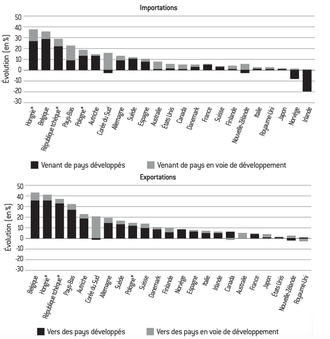Selon les données disponibles calculées par l’OCDE, pour la plupart des pays développés, l’essentiel de l’essor du commerce international depuis les années 1980 reflète la hausse des échanges avec d’autres pays développés. C’est notamment le cas pour la France. Cette évolution n’est pas explicable avec l’argument de Stolper et Samuelson évoqué précédemment. Des exceptions significatives existent toutefois à ce principe – notamment pour les États-Unis et la Corée du Sud, dont les échanges avec la Chine ont vigoureusement progressé sur la période.