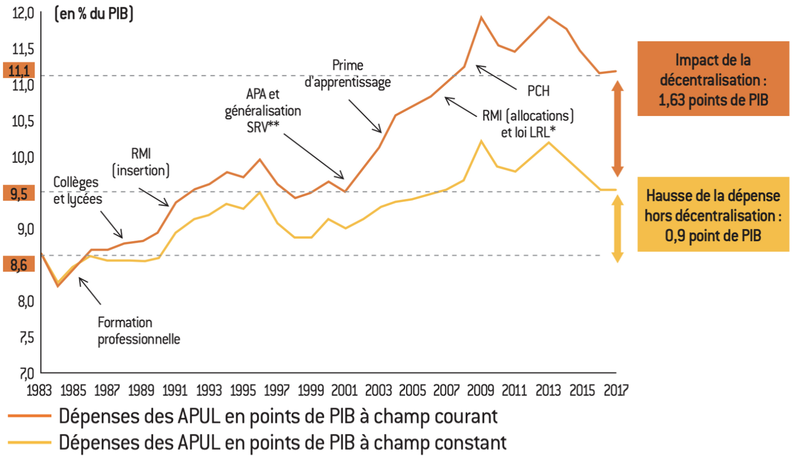 Évolution des dépenses des administrations publiques locales (APUL) rapportées au PIB, à champs de compétence courant et constant entre 1983 et 2017