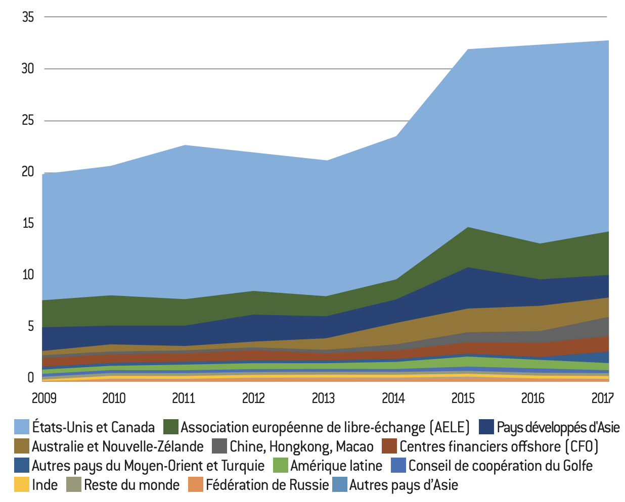 Part des actifs d’entreprises de l’Union européenne contrôlée par des investisseurs étrangers, par origine, 2009-2017 (en %)