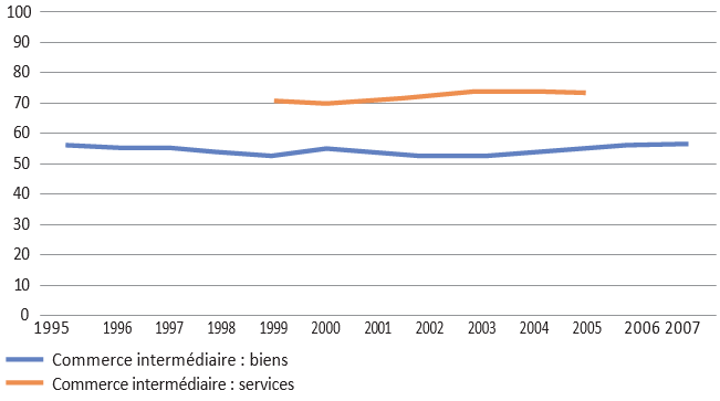 L’existence de cette chaîne logistique mondiale explique que près de la moitié du commerce mondial concerne des échanges de biens intermédiaires. Cette proportion est relativement stable dans le temps. Le commerce extérieur de l’OCDE est ainsi en bonne partie constitué de produits qui ne sont pas consommés mais utilisés dans une chaîne de production d’autres biens. Autrement dit, le contenu en importations des exportations des pays développés – ou la part des biens importés qui sont intégrés dans les biens exportés – n’a cessé d’augmenter. Ceci est vrai de la plupart des secteurs industriels. Là encore, les nouvelles théories du commerce international permettent d’expliquer cette caractéristique.