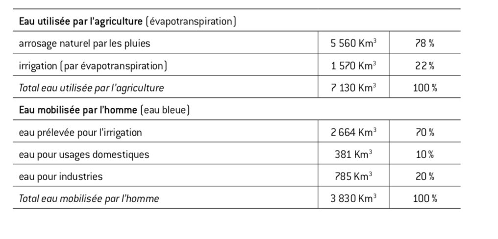 Le décompte des volumes d’eau par usage est révélateur : 78% de l’eau utilisée par l’agriculture est issue d’arrosage naturel par les pluies mais 70% de l’eau mobilisée par l’homme l’est pour l’irrigation.