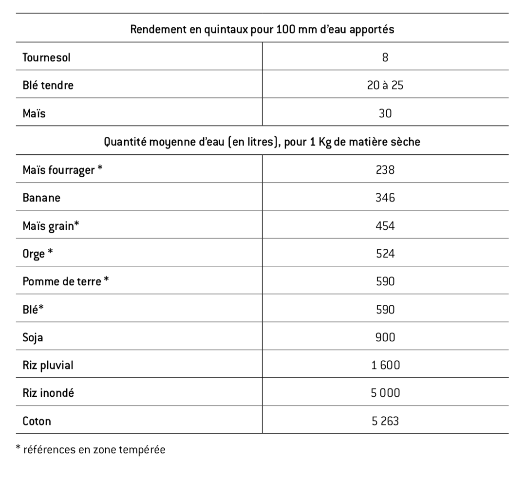 « L’efficience de l’eau varie d’une part avec les conditions climatiques, d’autre part avec l’espèce. […] On observe de grandes différences entre espèces pour un climat donné, avec une efficience maximale chez certaines espèces disposant d’un métabolisme dit C4 (maïs, sorgho), et une variabilité génétique importante à l’intérieur de chaque espèce.»5