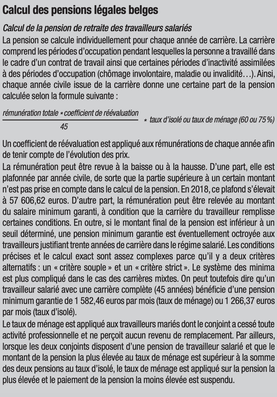 Notre présentation se fonde ici sur l’article d’Océane Bertrand et Sarah Scaillet, « Fonctionnement actuel du système de pension belge », in Benoît Bayenet, Maxime Fontaine, Dimitri Léonard et Alexandre Piraux (dir.), La Réforme des pensions, pour quels enjeux sociétaux ?, Larcier, 2019, p. 69-110.