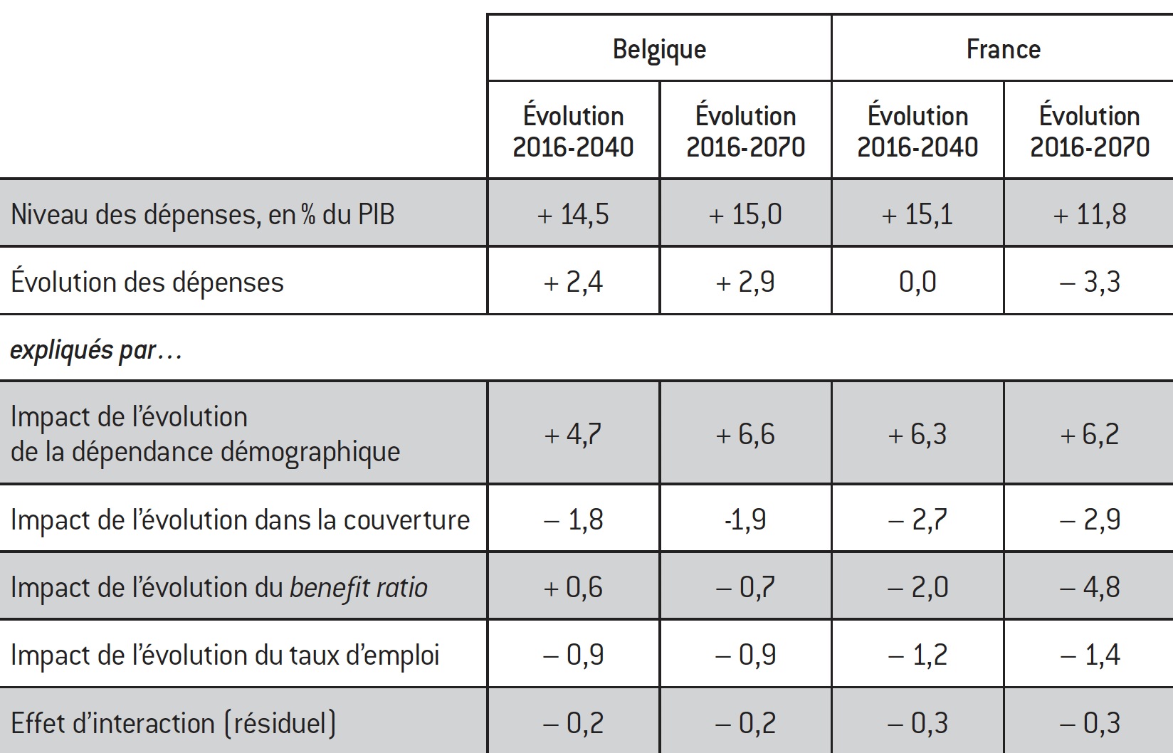 À très long terme, dans les projections centrales, l’impact de la démographie (hors la différence en taille des deux populations) est comparable pour la France et la Belgique : si les autres paramètres ne changent pas, le seul effet du vieillissement de la population serait d’augmenter les dépenses d’ici 2070 à 6,2% du PIB en France et à 6,6% en Belgique (à moyen terme, d’ici 2040, l’impact du vieillissement démographique est plus important en France qu’en Belgique). En France, cependant, dans ces projections centrales, l’impact du vieillissement serait plus que compensé par le report moyen de la prise de la retraite (qui est reflété dans l’évolution de la couverture), la diminution du benefit ratio et l’amélioration du taux d’emploi. L’impact de la diminution du benefit ratio français est le facteur le plus important dans cette dynamique. En revanche, en Belgique, le benefit ratio est présumé être plutôt stable à long terme, mais les dépenses publiques augmentent, en dépit du fait que la couverture diminue (c’est-à-dire que l’on prévoit un report moyen de l’âge de la retraite en Belgique, bien que son impact sur les dépenses soit moins prononcé qu’en France) et que le taux d’emploi augmente.