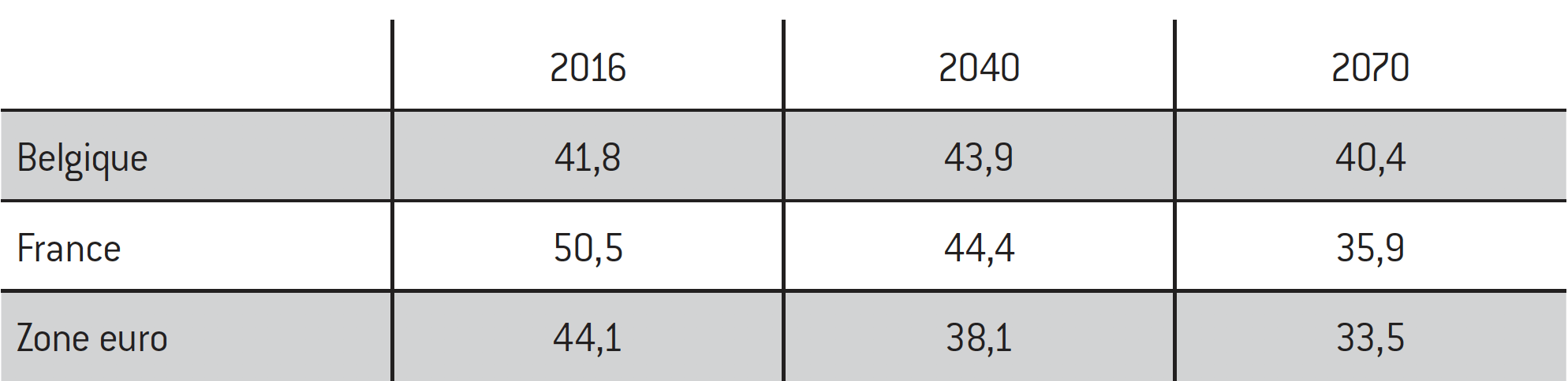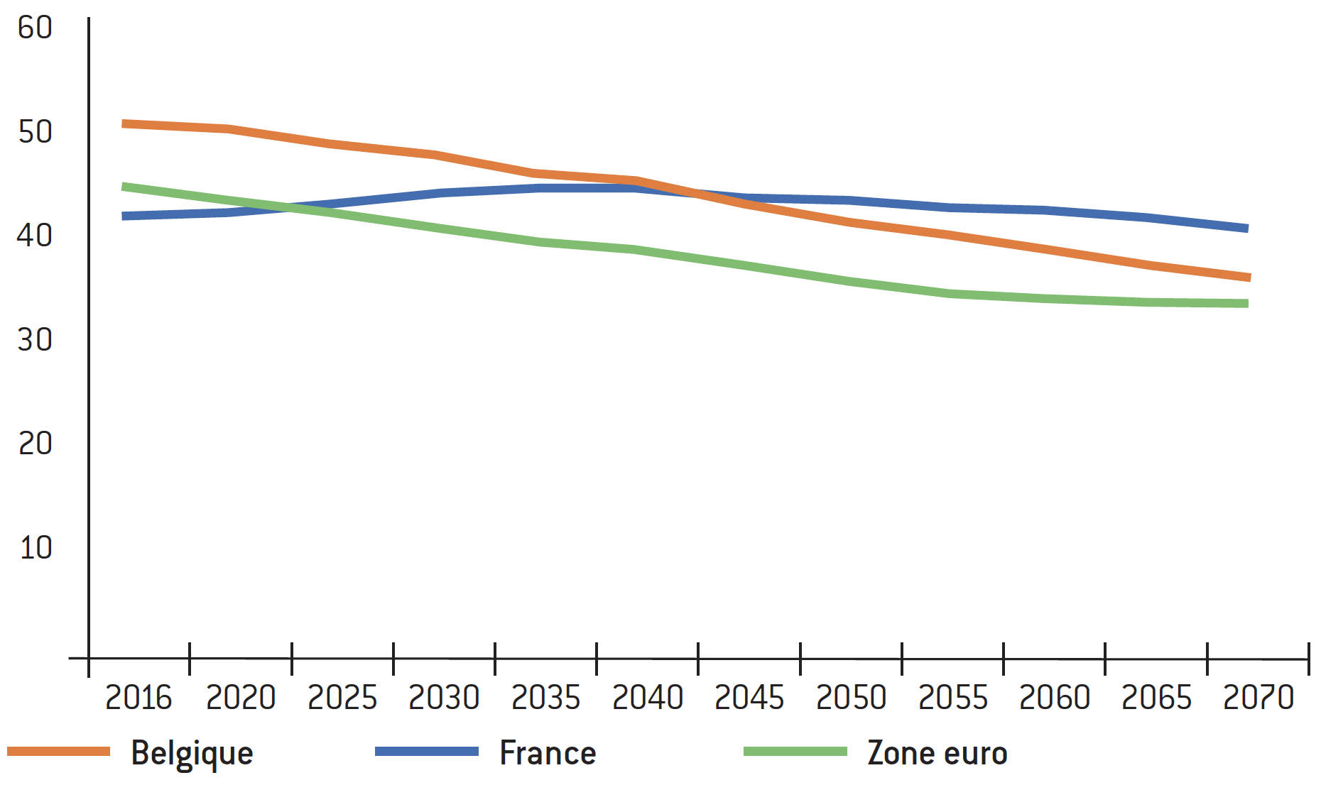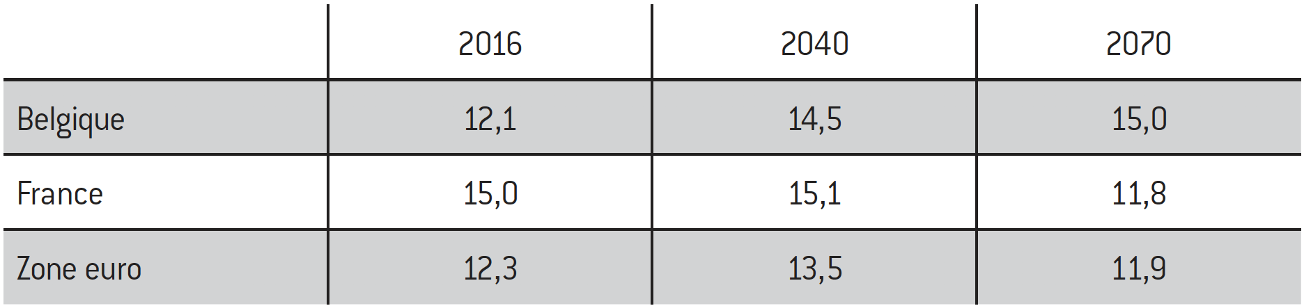 L’Ageing Working Group de l’Union européenne publie tous les trois ans une analyse de la dynamique à long terme des systèmes de retraite, se concentrant sur les pensions légales. Cette analyse est fondée sur une méthodologie uniforme et validée par tous les États membres et est donc très utile dans un exercice comparatif. Évidemment, l’exercice de projections à très long terme est extrêmement délicat et il faut bien en comprendre le sens et les limites. On ne peut pas prophétiser la situation économique et sociale d’ici à 2040. Il s’agit avant tout d’un outil d’analyse pédagogique illustrant les dynamiques qui sont possibles en fonction d’hypothèses variables et les risques qui se présentent. Ainsi, l’AWG développe une analyse de risques fort intéressante autour de ses projections centrales, en ajoutant à ses hypothèses principales un éventail d’hypothèses démographiques et économiques différentes. Les graphiques et tableaux de cette note présentent ces projections centrales. L’année 2016 est l’année la plus récente pour laquelle l’AWG dispose d’observations réelles dans son dernier rapport (celui de 2018)6 ; pour 2040 et 2070 les chiffres résultent des projections centrales. Elles reflètent en principe toutes les décisions politiques prises effectivement avant la rédaction du rapport.