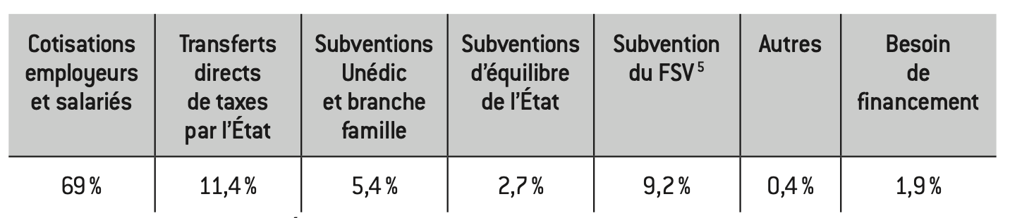 – considérer que seules les cotisations sociales et les impôts directement affectés au système de retraite sont de « vraies recettes » du système. Ainsi, les subventions de l’Unédic et des branches famille ou maladie aux caisses de retraite ne font que couvrir artificiellement un besoin de financement en transférant vers la branche retraite des cotisations affectées normalement à d’autres risques (chômage, famille, maladie). De la même façon, les subventions budgétaires directes de l’État au régime général et aux régimes spéciaux ne font que masquer des besoins de financement du système de retraite et entraînent un déport de charges indues vers l’État ;