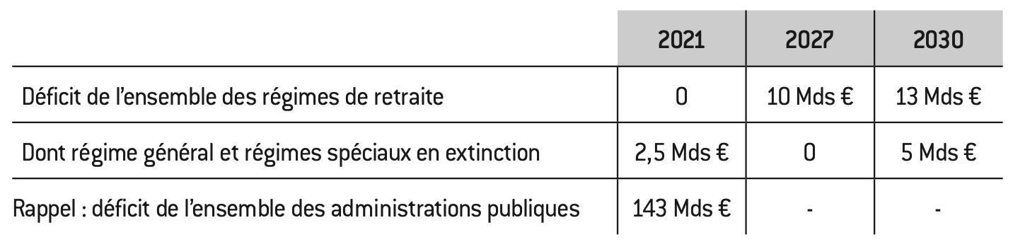 Ce chiffre étant lui-même hypothétique (il était nul sous des hypothèses optimistes du COR) ; des chiffres par ailleurs à rapprocher des quelque 143 Mds d’euros de déficit de l’État en 2021.