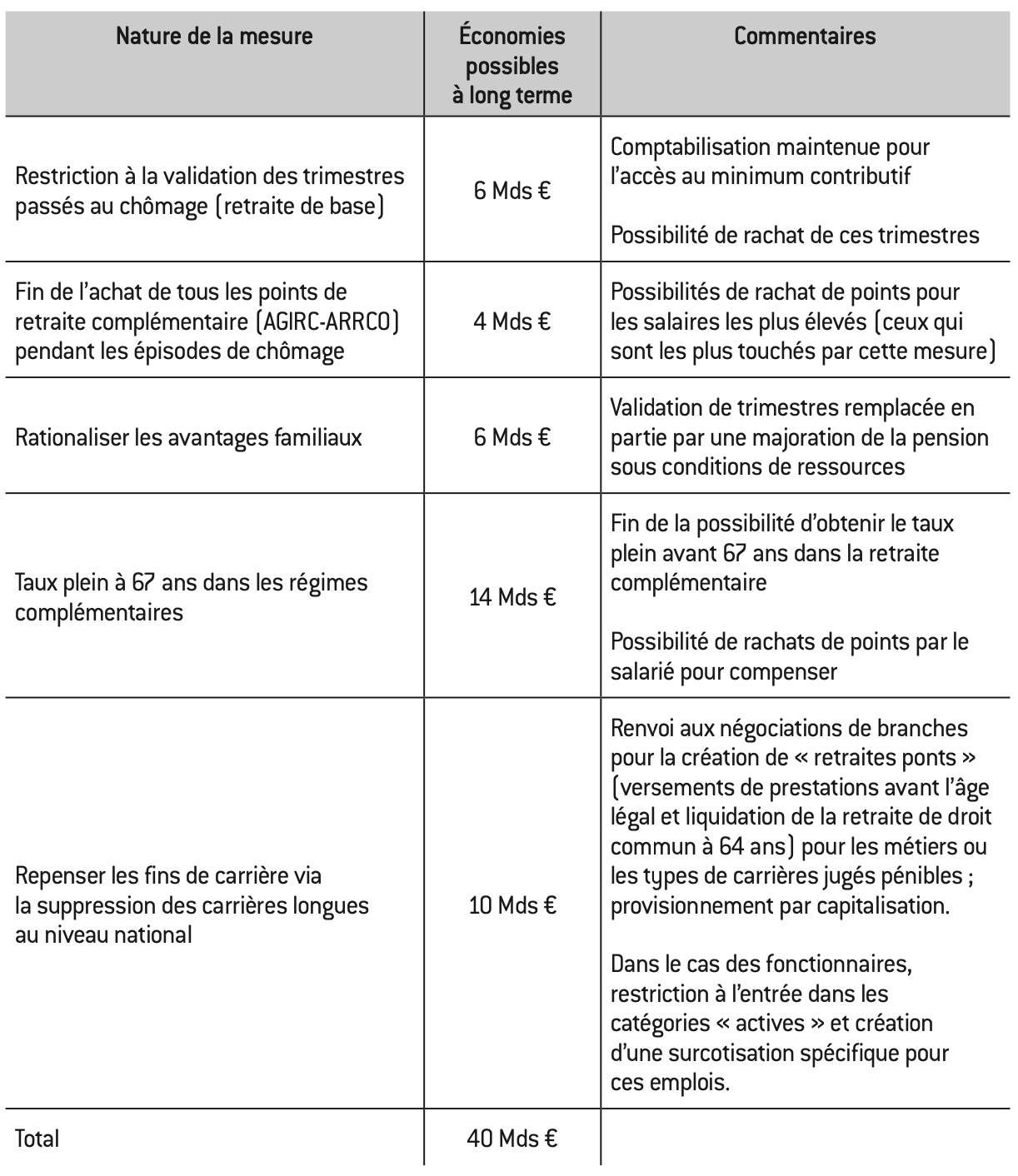 En complément de ce premier travail, la présente note propose des pistes d’économies et de rationalisation des dépenses pour permettre la montée en charge d’un financement partiel des retraites par capitalisation, sans alourdir la fiscalité et les charges pesant sur le travail, et en améliorant les finances publiques. Elle réexamine les voies d’amélioration du système actuel sans toucher à l’âge légal et à la durée de cotisation de manière générale, mais en se concentrant de manière pragmatique sur quelques aspects qui rendent le système actuel à la fois opaque, inéquitable et exagérément coûteux.