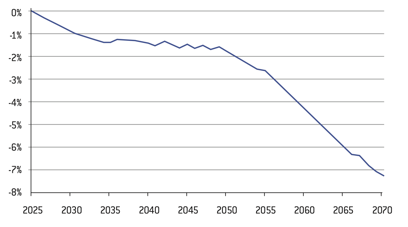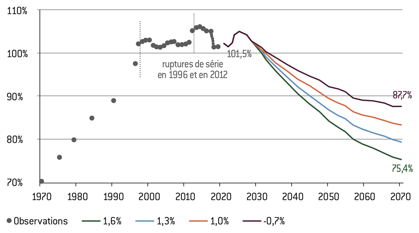 Les projections du scénario de base (en l’absence de réforme) sont celles publiées par le COR dans sa variante centrale en projection 2025-2070 : évolutions démographiques projetées par l’Insee, évolution annuelle de la productivité de 0,7%.
