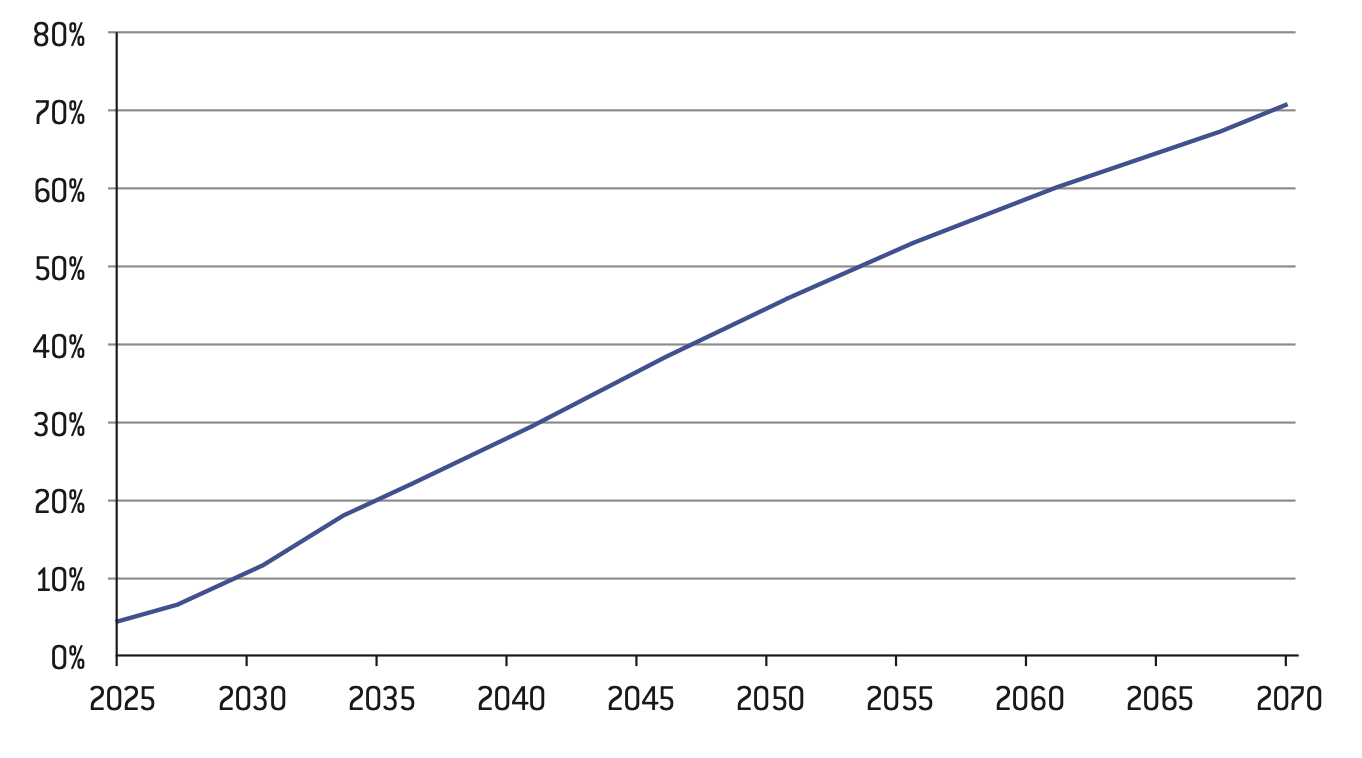 Au total, la montée en charge du pilier par capitalisation serait nécessairement très progressive : on peut ainsi estimer que la proportion des pensions du secteur privé versées par capitalisations serait de 25 % en 2070.