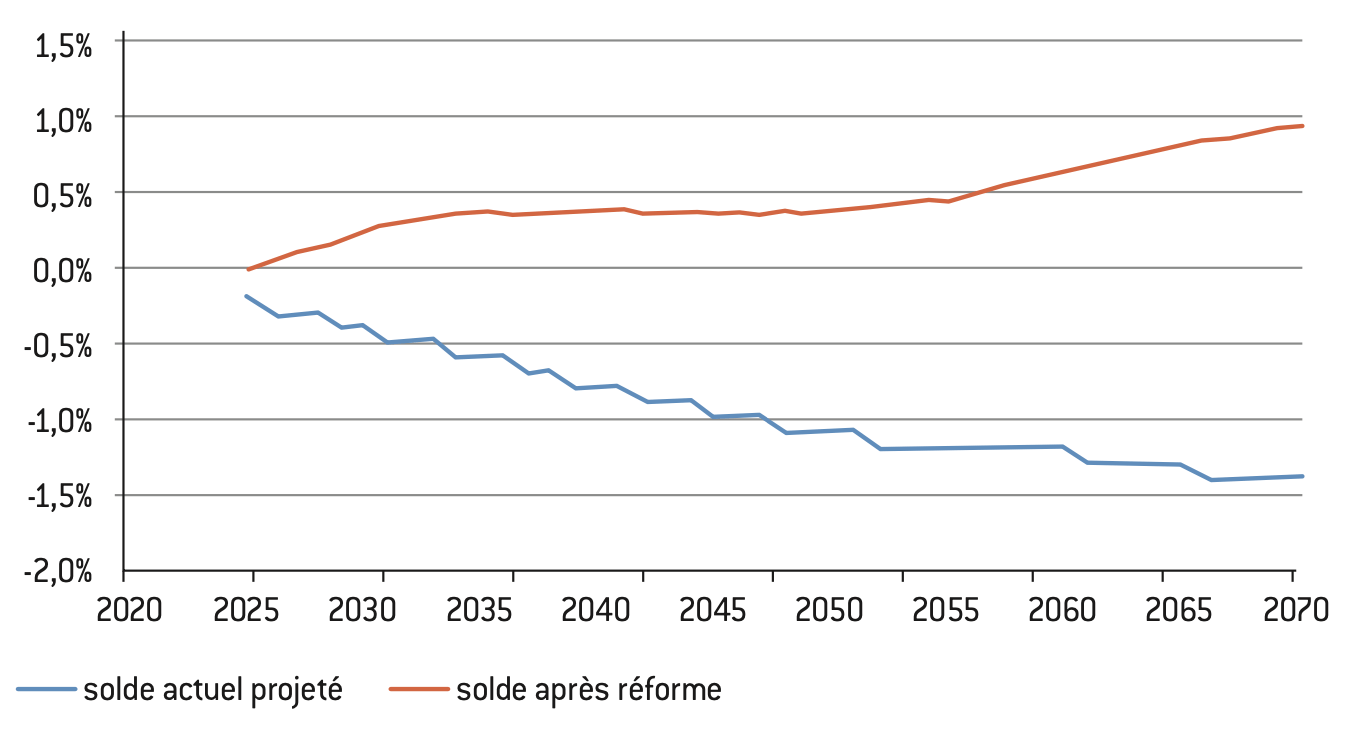 Il est choisi de manière à ce que chaque année le pilier répartition soit équilibré en recettes et dépenses (le taux de cotisation actuel est donc réhaussé de manière à couvrir les déficits projetés par le COR actualisé par le rapport de la Cour des comptes de février 2025) tout au long de la période de projection (2025-2070). Ce choix implique de corriger les déficits projetés dans le système actuel car il ne saurait être question de continuer à accumuler de la dette dans le système par répartition alors même que l’on accumule du capital pour le pilier par capitalisation. En effet, tout l’intérêt économique de l’opération consiste à accroître les actifs nets de la nation. Pour assurer que le système par répartition soit toujours à l’équilibre, il serait nécessaire de réajuster le taux de cotisation par répartition à la hausse ou de désindexer davantage les pensions si le déficit s’avérait plus important que celui projeté par le COR et la Cour des comptes.