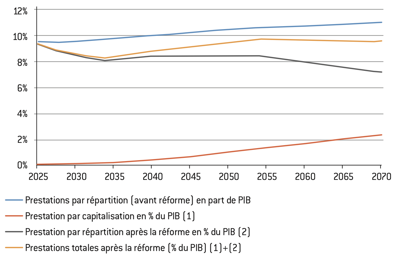 La combinaison de ces dotations initiales, de nouvelles recettes et de la diminution accélérée des dépenses du pilier répartition permettrait d’enclencher la constitution du fonds et le versement de premières pensions par capitalisation sans accroître les prélèvements nets sur le travail : en effet, la cotisation de 4% pour la capitalisation serait très exactement compensée par une diminution du taux de cotisation actuel (28% du salaire brut). Au fur et à mesure de la montée en puissance du système par capitalisation, la somme du taux de cotisations par répartition et du taux de cotisations par capitalisation aboutirait à une diminution nette des cotisations, jusqu’à environ 7 points à l’horizon 2070 (une diminution de 11 points de la cotisation par répartition et création d’une cotisation par capitalisation à hauteur de 4%).