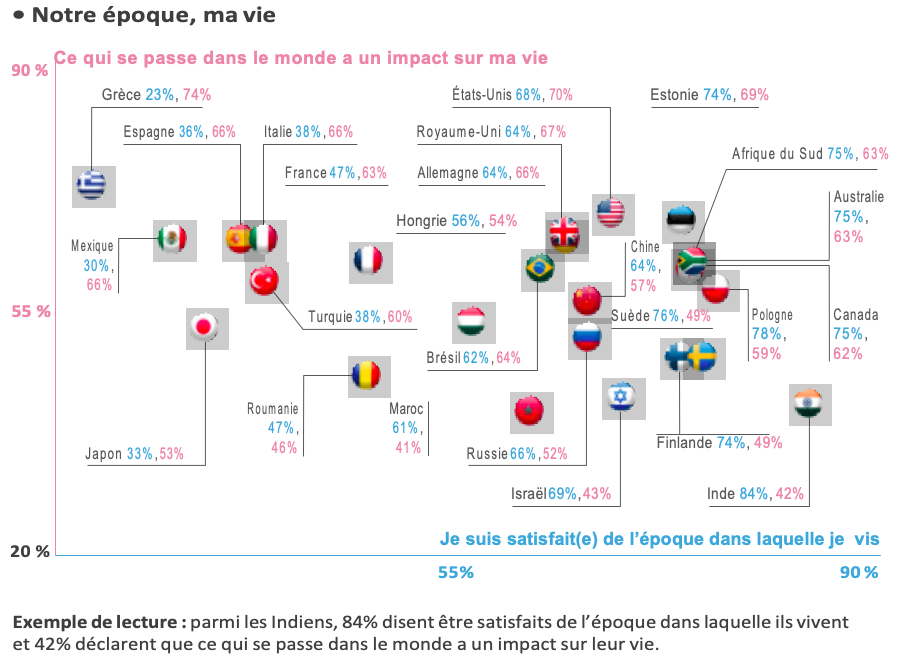 Voici bien un élément capital révélé par notre étude : lorsque la plupart des jeunes sont insatisfaits de la situation générale de leur pays (61%) ils se disent en revanche satisfaits de l’époque dans laquelle ils vivent (59%). Le pays déçoit mais l’époque console. Avis aux responsables politiques, beaucoup d’indications essentielles sont contenues dans cette dissociation, comme si les pays, par leur état politique, économique, social mais aussi et peut-être plus encore, culturel, par un manque d’ambition, entravaient leur propre jeunesse pourtant désireuse, par nature et par conviction, de prendre pied dans une vie nouvelle à laquelle la globalisation confère le projet et le souffle qui font défaut à beaucoup de nations. Aujourd’hui, pour la plu- part des jeunes interrogés, le cours de l’histoire est incomparablement plus enthousiasmant que les programmes électoraux ou de gouvernement. La société est plus prometteuse que l’État.