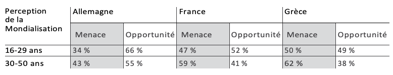 La mondialisation est considérée comme une opportunité par 91% des Chinois, 87% des Indiens et 81% Brésiliens, tandis qu’un jeune Grec sur deux y voit une menace, de même que 47% des Français. Les jeunesses marocaine et turque sont les seules des pays en développement qui restent partagées sur la question (49% y voient une opportunité). Du côté des pays riches, les jeunesses scandinaves, en revanche, perçoivent massivement la globalisation en termes d’opportunité (76% des Suédois, 74% des Finlandais).