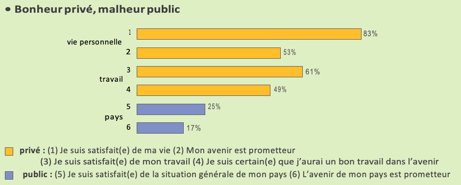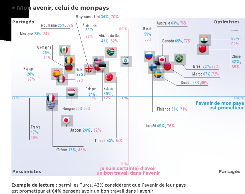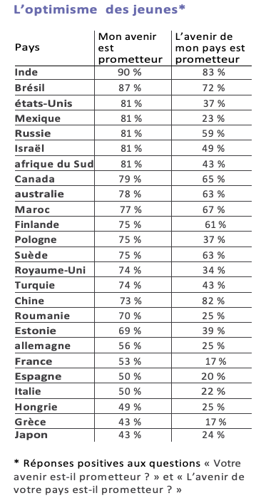 À peine un Français sur deux (53%) juge son avenir personnel prometteur, contre 61 % pour la jeunesse européenne. Seules les jeunesses grecque et japonaise (43%), hongroise (49%), italienne et espagnole (50%) sont moins optimistes encore. Mais lorsqu’on interroge les Français sur le fait de savoir si l’avenir de leur pays est prometteur, ils sont 75% à répondre par la négative ! On peut comparer les 17% de Français qui pensent que l’avenir de leur pays est prometteur avec le chiffre des Chinois (82%) ou des Indiens (83%). Dans un autre ordre d’idée mais avec des résultats qui vont dans le même sens, 70% des jeunes interrogés dans le monde sont d’accord pour dire
