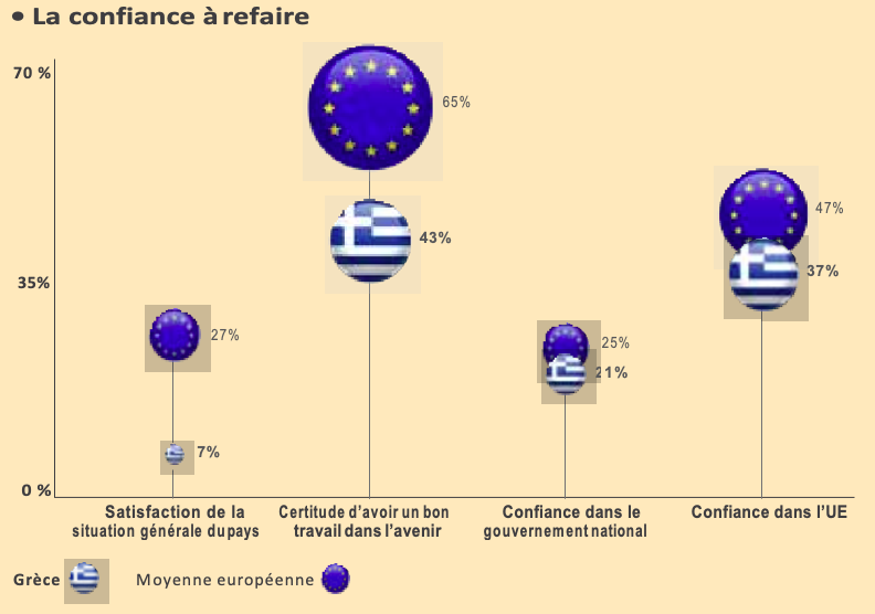 Aucun pays ne démontre mieux les effets de la conjoncture sur les opinions que la Grèce. 74% des jeunes Grecs admettent que ce qui se passe dans le monde a un impact sur leur vie, contre 63% des Européens en moyenne. Il est frappant de constater à quel point la crise a rendu les Grecs pessimistes : seuls 42% d’entre eux sont satisfaits de leur travail, 30% de leur situation économique, 23% de l’époque et 7% de la situation générale de leur pays ; 49% d’entre eux sont pessimistes quant à leur avenir personnel et 80% quant à l’avenir de leur pays. De plus, seuls 43% des jeunes Grecs sont sûrs qu’ils auront un bon travail (contre 65% des Européens). Plus d’un tiers (35%) souhaite habiter à l’étranger. Enfin, leur niveau de confiance dans les institutions est particulièrement faible, que ce soit dans le gouvernement (21%), le parlement (18%) ou les médias (19%). La confiance qu’ils placent dans les instances