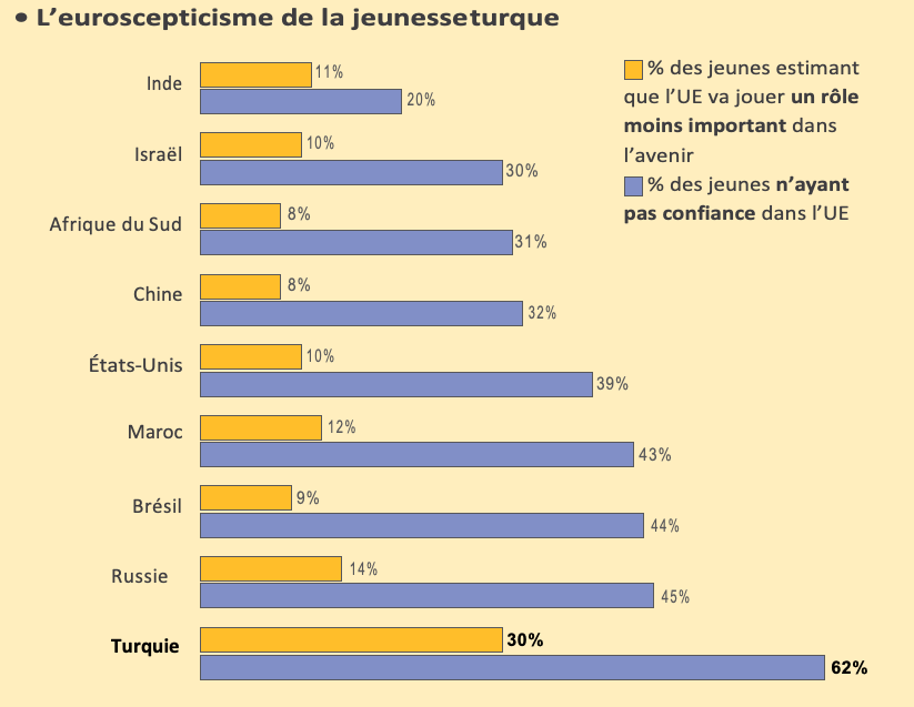 Cette méfiance vis-à-vis de l’UE est couplée à une méfiance envers les Nations-Unies, exprimée tant par les jeunes (55%) que par leurs aînés (63%). L’euroscepticisme de la jeunesse turque s’inscrit donc dans une conception globale du monde. Ainsi ils émettent une appréciation ambivalente de la mondialisation : 49% des jeunes Turcs la considèrent comme une menace, 49% comme une opportunité. De même, 27% d’entre eux anticipent un affaiblissement du rôle des États-Unis, leur allié privilégié de longue date – seuls les Russes sont plus nombreux (34%) à imaginer une perte d’influence de Washington. Tout se passe comme si le regard de la jeunesse turque se tournait ailleurs : ainsi, selon elle, les deux pays qui verront leur rôle croître dans l’avenir sont la Russie (45%) et, plus encore, la Chine (62%).