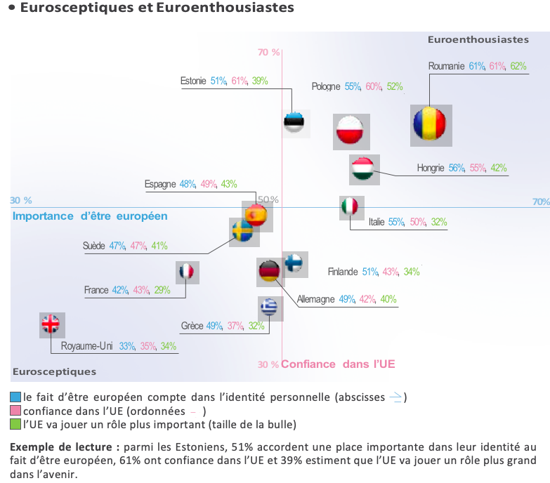Seulement 47% des jeunes Européens disent avoir confiance dans l’Union, ce qui représente une adhésion mitigée pour la génération Erasmus. La confiance est plus grande au sein de la jeunesse des nouveaux pays membres, qu’il s’agisse des Roumains (61%), des Estoniens (61%), des Polonais (60%) ou des Hongrois (55%). En comparaison avec cet engouement pour l’intégration européenne de la part des nouveaux citoyens de l’UE, les jeunes d’Europe de l’Ouest se montrent sceptiques, puisque seuls les Italiens se disent majoritairement confiants (50%, contre 44% de défiants). Toutefois, les jeunes Européens font davantage confiance à l’UE que leurs aînés avec un écart de sept points en moyenne, tandis que chacune des générations accorde dans l’identité une certaine importance au fait d’être européen.