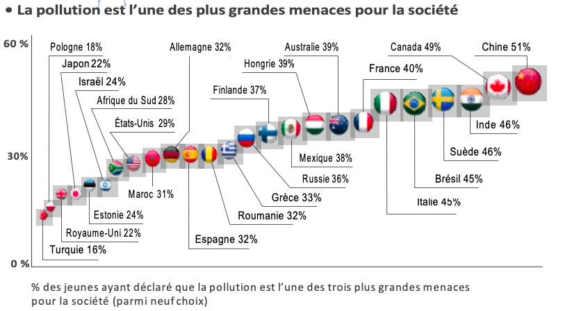 Dans le monde, en dehors des pays cités, ce sont les Canadiens (49%) et les Australiens (39%) qui manifestent la plus grande préoccupation pour l’environnement avec, à l’opposé, les Israéliens (24%), les Japonais (22%) et les Turcs (16%).
