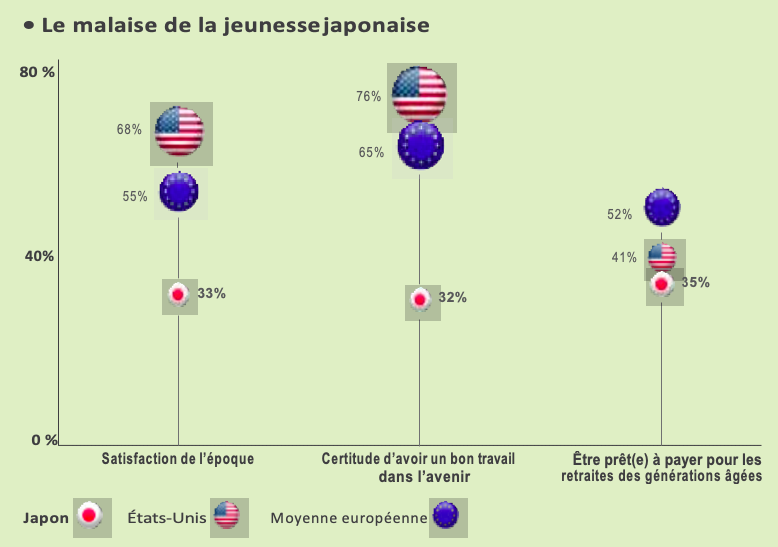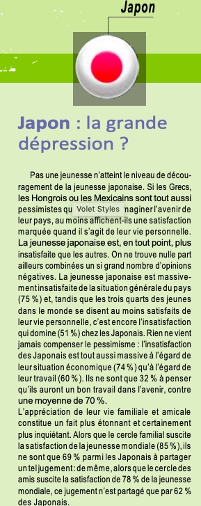 Parmi les vingt-cinq pays couverts par notre enquête, seule la jeunesse grecque porte un juge- ment aussi pessimiste sur l’avenir de son propre pays. Toutes les autres jeunesses européennes et même la jeunesse japonaise sont plus optimistes. La jeunesse française s’affirme donc comme l’une des plus pessimistes du monde.