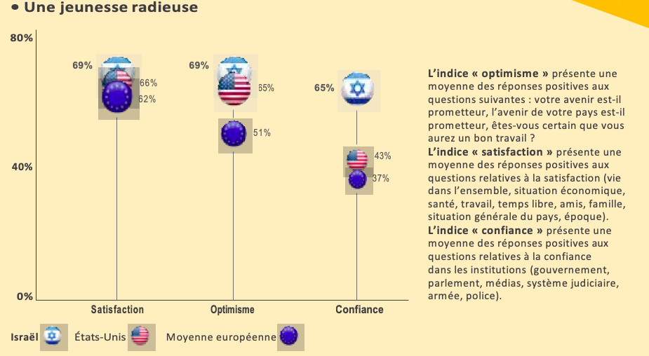 83% des Français disent qu’ils sont satisfaits de leur vie, ce qui est supérieur à la moyenne européenne (78%). En Europe, seuls les Polonais sont plus satisfaits (85%). Dans le monde, seule la jeunesse israélienne (83%) parvient au niveau de satisfaction de la jeunesse française. De même, les Français sont massivement satisfaits de leur temps libre (73%), de leurs amis (79%), de leur santé (83%) ou de leur famille (85%).