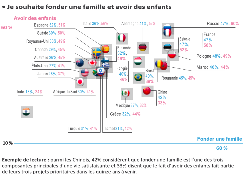 Lorsque l’on demande aux Français ce qui correspond le plus, pour eux, à une vie satisfaisante, ce ne sont pas « gagner beaucoup d’argent » (14%) ni « se sentir libre » (18%) qui arrivent en tête, mais « fonder une famille » (47%), soit un chiffre très supérieur à la moyenne européenne (39%) et que ne dépassent ou n’égalent dans le monde que les Polonais (48%), les Estoniens et les Russes (47%) ou les Marocains (46%). De la même façon, si l’on pose la question de savoir ce que l’on souhaite accomplir au cours des quinze prochaines années, les Français déclarent vouloir acquérir une maison ou un appartement dans des proportions