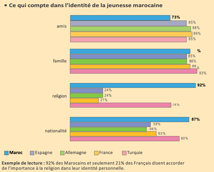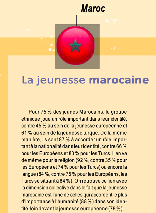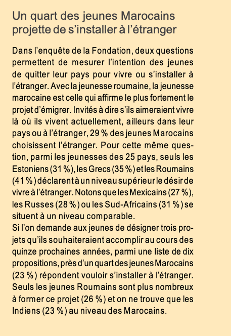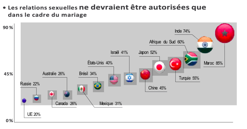 91% des Allemands, des Finlandais, des Australiens et des Britanniques). La jeunesse marocaine est la plus rétive à l’égalité des sexes, 50% des Marocains ne retenant pas ce critère pour définir leur société idéale, de même, mais dans une moindre mesure, que les jeunesses japonaise (30%), israélienne (24%) et turque (20%).