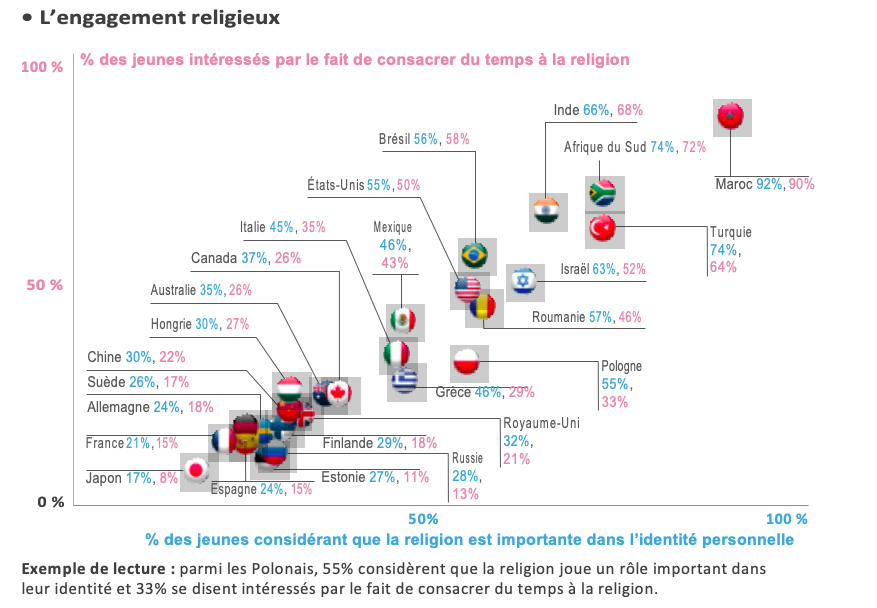 Les jeunesses les plus favorables au port des signes religieux sur le lieu de travail sont celles du Maroc (66%), d’Israël (65%), des États-Unis (65%) et de Pologne (61%), où la religion joue un rôle important sur les plans politique et sociétal. À l’autre bout du spectre, les Japonais y sont les moins favorables (19%). La situation est contrastée dans les pays qui accueillent des populations provenant de pays musulmans. Les Français sont les moins favorables (22%) au port de signes religieux sur le lieu de travail. Les Allemands y sont également opposés, mais dans une proportion moins importante (42% acceptent le port des signes religieux). En revanche, les Britanniques y sont majoritairement favorables (57%).