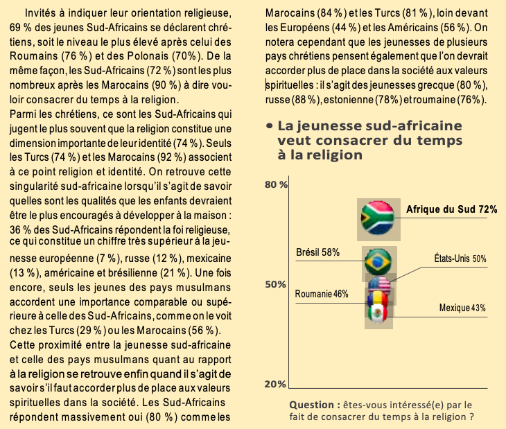 Ainsi, lorsque l’on demande aux jeunes de dire quelle dimension collective est importante pour leur identité, l’humanité (81%) arrive loin devant la nationalité (70%), le groupe ethnique (53%) ou la religion (43%) souvent réputés compter davantage. Si l’on interroge sur le fait de savoir quelles sont les trois qualités qu’il faut transmettre aux enfants à la maison, parmi une liste de treize pro- positions, deux d’entre elles ressortent nettement en tête : l’honnêteté (58%) et la responsabilité (55%). Fait notable, à l’exception de la jeunesse marocaine, qui place la foi religieuse en première position (56%), cette hiérarchie est donnée par chacune des jeunesses composant le panel.