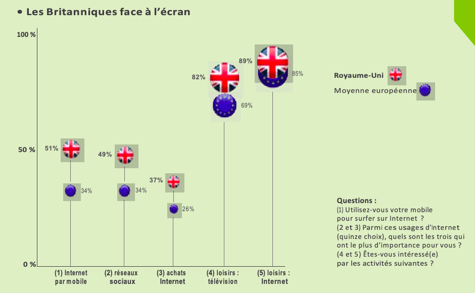 Si les jeunes sont férus de nouvelles technologies, les Britanniques en sont les champions. L’informatique façonne leur temps libre, 89% des jeunes étant intéressés par Internet et 60% par les jeux vidéo. 82% des Britanniques sont également des amateurs de télévision, la moyenne européenne se situant à 69%. Toutefois, c’est dans l’usage d’Internet que leur penchant pour les nouvelles technologies se montre avec le plus de force. Un jeune Britannique sur deux utilise son portable pour surfer, la moyenne européenne étant de 34%. Enfin, ils sont plus nombreux à se rendre sur les réseaux sociaux (49%, contre une moyenne européenne de 34%) et à effectuer leurs achats en ligne (37%, contre 26% des Européens).
