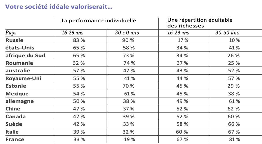 Les disparités intergénérationnelles sont intéressantes à relever. Ainsi, en Chine, 47% des jeunes expriment leur attachement à la récompense de la performance individuelle, contre 37% des 30-50 ans. Des écarts comparables se retrouvent en Italie, aux États-Unis, au Canada, en Suède, en Australie, en Allemagne, au Royaume-Uni et en France. À l’inverse, les jeunes Estoniens, Roumains, Sud-Africains, Russes et Mexicains optent plus souvent pour une répartition équitable des richesses que leurs aînés.