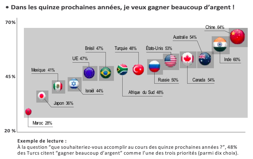 En outre, 34% des Chinois et 41% des Indiens considèrent que gagner beaucoup d’argent constitue un critère important d’une vie satisfaisante. De la même façon, les jeunes de ces deux pays considèrent le fait de gagner beaucoup d’argent comme un objectif à accomplir dans les quinze prochaines années : c’est le cas de 64% des Chinois et 60% des Indiens. Cet objectif n’est pas l’apanage des jeunesses des pays émergents, puisqu’il est également très populaire chez les Australiens, les Canadiens et les Allemands (54%) ou chez les Américains (53%). Gagner beaucoup d’argent compte moins pour les Italiens (39%), les Grecs (37%), les Japonais (36%) et les Hongrois (33%). On remarquera que cet objectif est partagé par 48% des Français, soit un chiffre équivalent à la moyenne européenne (47%).