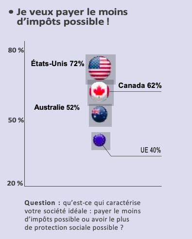 Appelés à choisir entre le moins d’impôts possible et le plus de protection sociale possible, 62% des Canadiens et 52% des Australiens optent pour la première solution. Ils ne sont devancés que par les jeunes Américains, qui sont 72% à préférer une société où l’on paie le moins d’impôts possible. Naturellement, cette préférence pour des prélèvements obligatoires plus faibles ne se traduit pas par une attitude rebelle vis-à-vis de l’impôt : 89% des Américains, 87% des Australiens et 84% des Canadiens admettent que chacun doit payer ses impôts.