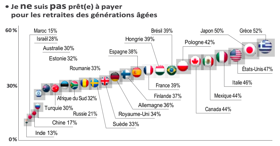 En totale opposition avec les jeunes des pays riches, 83% des Indiens, 77% des Chinois, 76% des Marocains et 73% des Russes se disent prêts à payer pour les retraites de leurs aînés. Parmi les puissances émergentes, la jeunesse brésilienne est relativement peu encline à financer les retraites des générations âgées (54%) et si la tendance est en hausse par rapport aux 30-50 ans (48%), la proportion des jeunes refusant cet effort est importante (39%). En Europe de l’Est, très touchée par le vieillissement de la population, la jeunesse est partagée : si 63% des Estoniens et 60% des Roumains déclarent accepter de payer pour les retraites des générations âgées, ce n’est le cas que de 46% des Polonais. Le système par capitalisation n’explique pas tout : les Polonais ont basé leur système mixte sur le modèle allemand, mais la jeunesse allemande (56%) accepte plus largement de financer les retraites des aînés que la jeunesse polonaise (46%).
